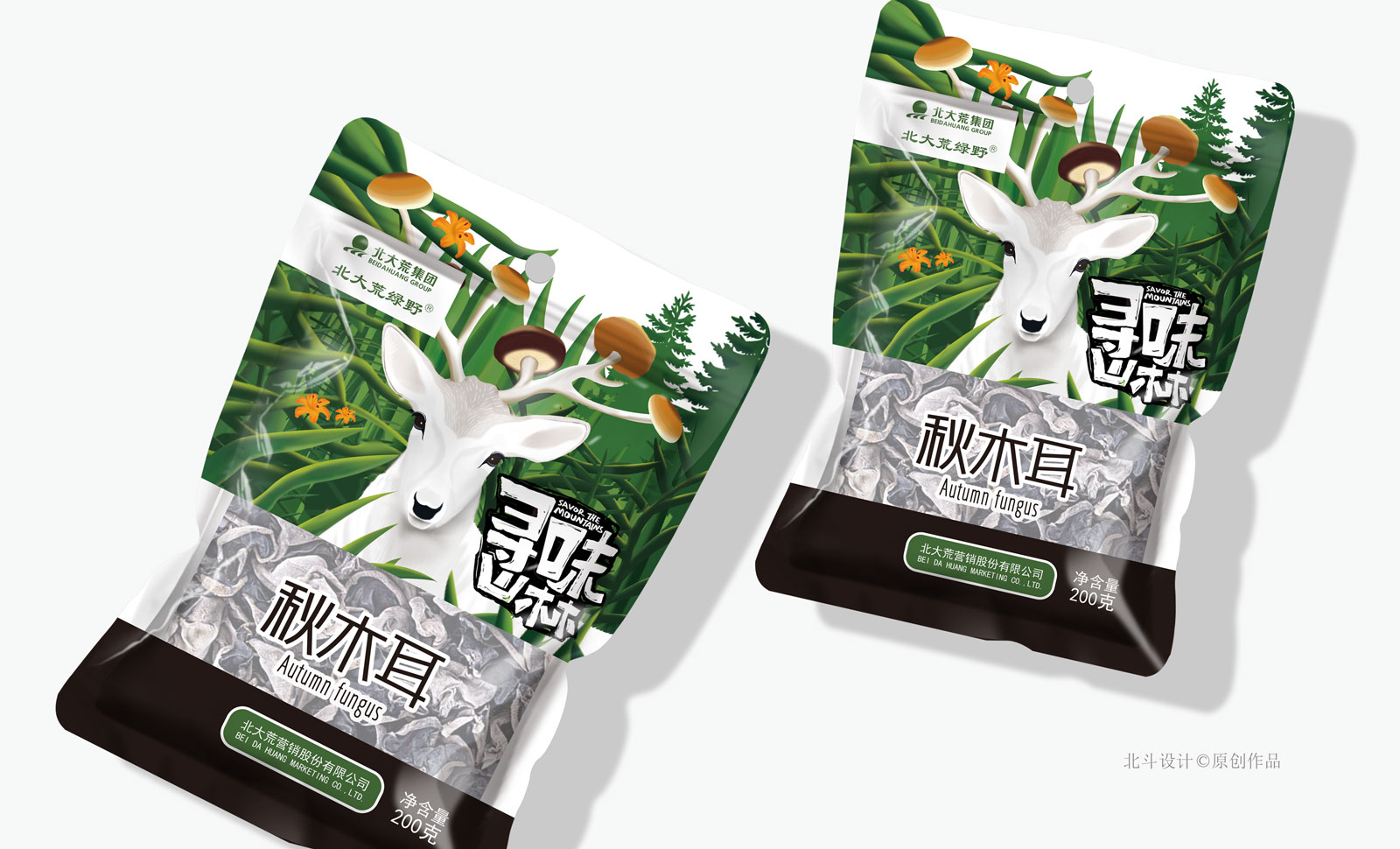 北大荒集团此次下单给到北斗设计的项目是塑造一个山珍系列的产品包装设计,从单个包装到礼盒包装,设计需求是需要消费者能够在第一时间记住我们北大荒的山珍这个品类。一共三个产品:木耳,黄花菜,香菇。这三个产品都属山珍野味,北斗设计为其取一个名字叫做:寻味山林。蕴意北大荒集团把最天然最健康的产品提供给到消费者食用。