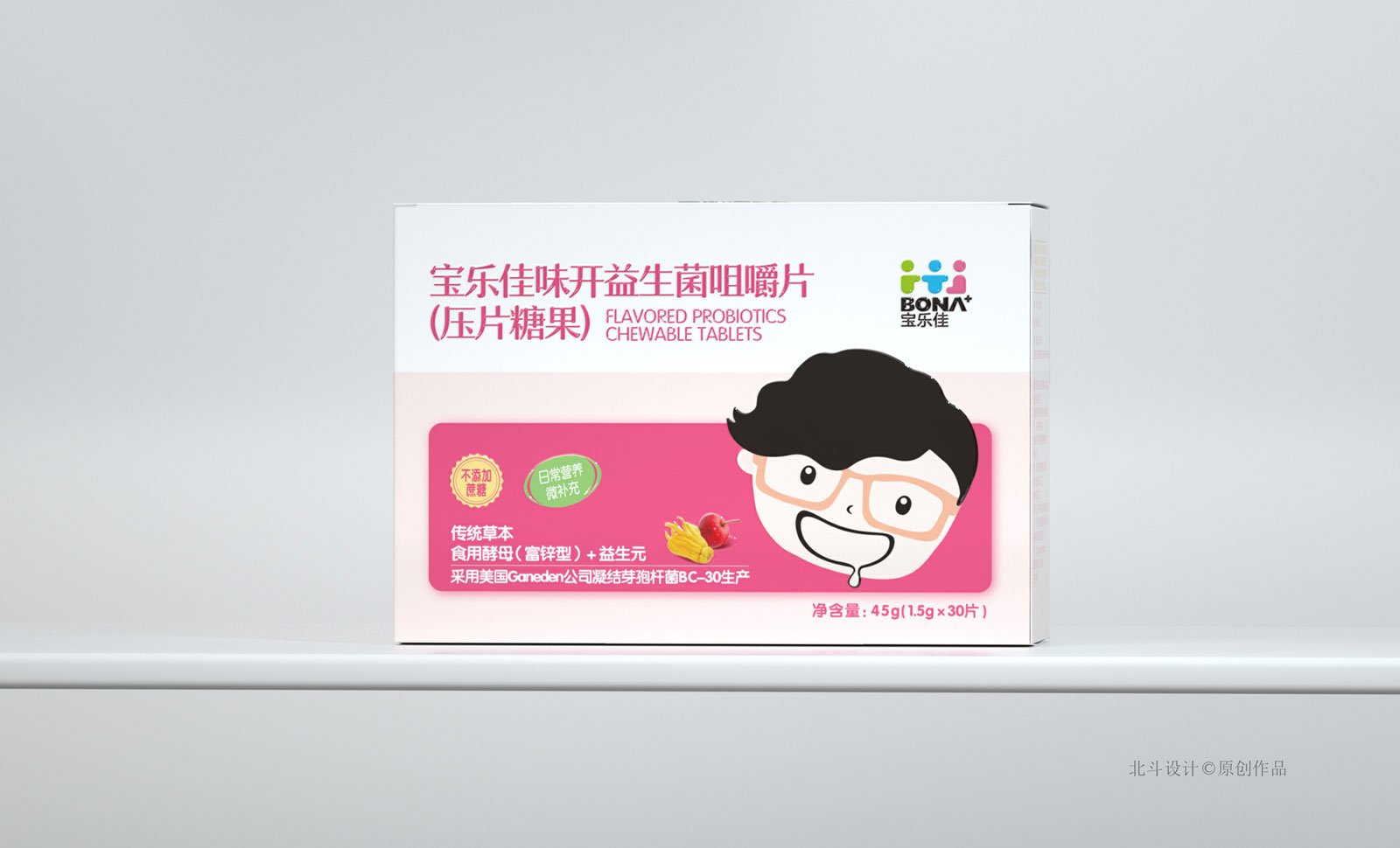 宝乐佳这款压片糖果系列包装设计,在同类产品中定位是中高端,所以在产品包装的设计工艺,和设计美学上都是比较高的要求。北斗设计采用的创意符号是儿童卡通表情符号,通过不同的表情符号表现不同类型的糖果,通过卡通的趣味心态带给用户更有趣的体验感;色彩表现采用的是粉色系,这种色系更能受到儿童用户的青睐。